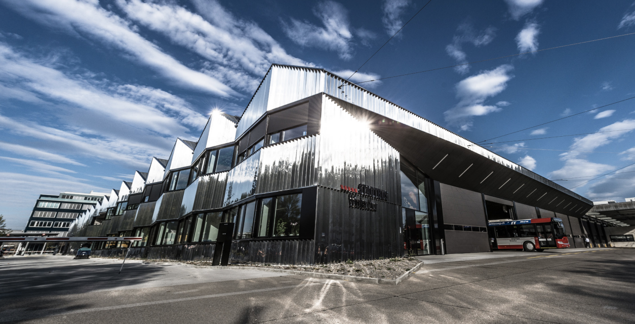 Der Neubau von Stadtbus Winterthur kann sich sehen lassen: Die Fassade aus poliertem Chromstahlblech glänzt schimmernd im Sonnenlicht und betont die architektonisch spezielle Bauweise des neuen Busdepots. Nach einer rund 20- monatigen Bauzeit sind die neuen Bushallen und der integrierte Verwaltungstrakt im Grüzefeld seit August 2015 in Betrieb. Mit dem alten Depot am Deutweg war Stadtbus Winterthur an seine Kapazitätsgrenzen gelangt, sodass mit dem Neubau eine möglichst komplette Lösung angestrebt wurde, die sowohl wirtschaftlichen als auch ökologischen Ansprüchen gerecht wird. Das Ziel war eine möglichst langfristig planbare Lösung, um den Grundstein für weitere Entwicklungsmöglichkeiten zu legen.